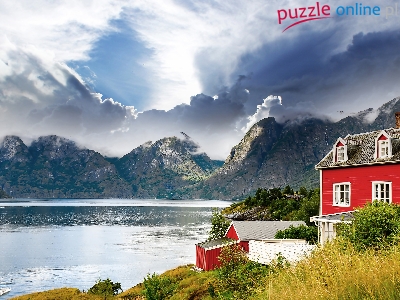 Chmury, Dom, Góry, Jezioro, Roślinność