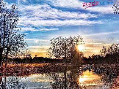 Puzzle Chmury, Promienie Słońca, Jezioro, Drzewa