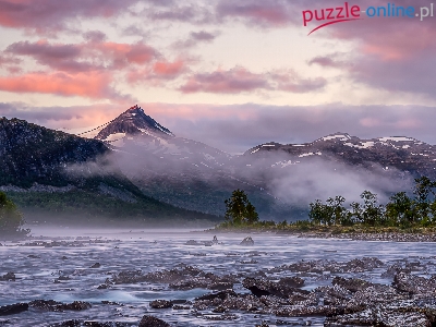 Mgła, Góry, Kamienie, Chmury, Drzewa, Rzeka, Poranek
