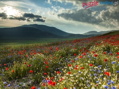 Puzzle Chmury, Łąka, Kwiaty, Wzgórza