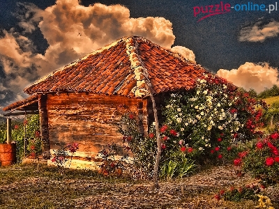 Puzzle Kwiaty, Chmury, Domek