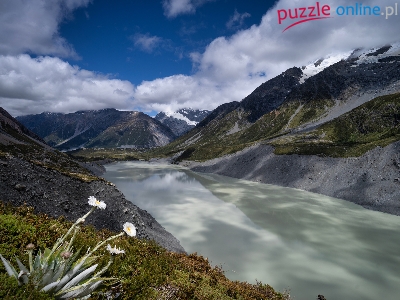 Puzzle Kwiaty, Góry, Jezioro, Chmury