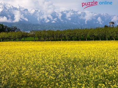 Drzewa, Pole, Las, Chmury, Góry, Rzepak, Mgła