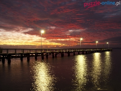 Chmury, Pomost, Słońca, Jezioro, Latarnie, Zachód