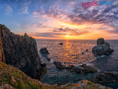 Niebo, Wybrzeże, Morze, Zachód słońca, Kamienie, Skały, Chmury
