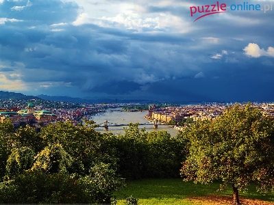 Puzzle Chmury, Rzeka, Niebo, Drzewa