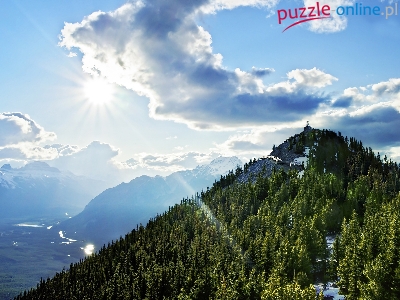 Chmury, Las, Słońca, Góry, Niebo, Promienie