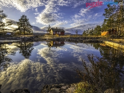 Norwegia, Chmury, Odbicie, Dom, Ringerike, Jezioro, Drzewa