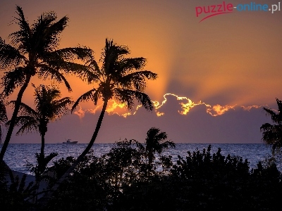 Chmury, Statek, Słońca, Morze, Palmy, Zachód