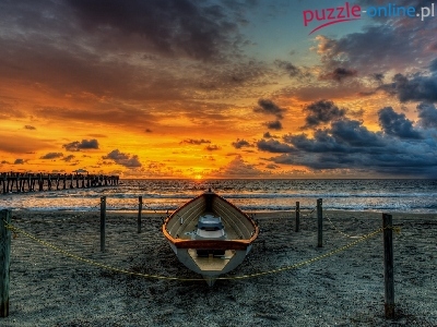 Morze, Plaża, Zachód słońca, Łódka, Molo, Chmury