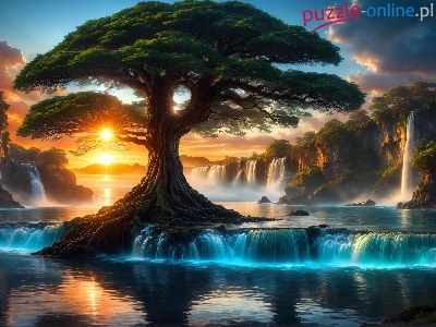 Zachód słońca, Rzeka, Drzewo, 2D, Wodospady, Kaskada, Chmury