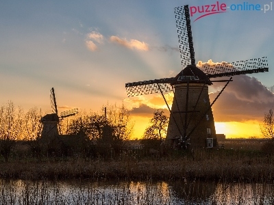 Chmury, Słońca, Wiatraki, Rzeka, Zachód