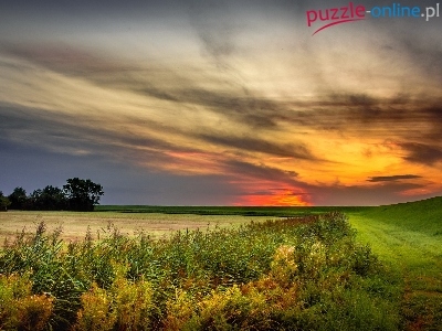 Chmury, Roślinność, Pole, Zachód słońca, Drzewa