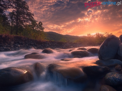 Gruzja, Rzeka Rioni, Zachód słońca, Kamienie, Region Racza-Leczchumi, Chmury