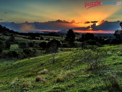 Chmury, Drzewa, Zachód, Słońca, Trawy