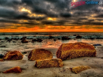 Chmury, Kamienie, Zachód, Słońca, Morze