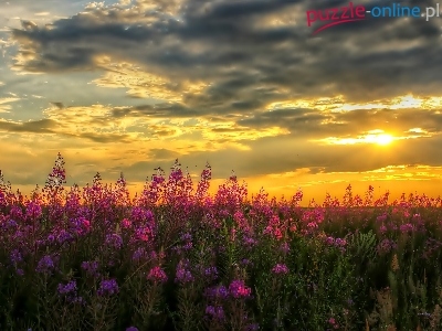 Puzzle Chmury, Zachód Słońca, Kwiaty