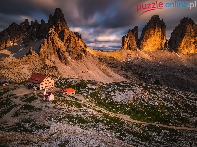 Schronisko, Śzczyty Tre Cime di Lavaredo, Zmierzch, Góry, Dolomity, Chmury, Włochy, Domy