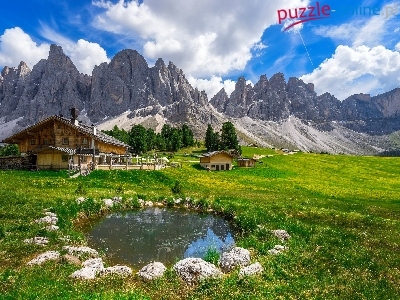 Dolomity, Dom, Drzewa, Góry, Włochy, Park krajobrazowy Puez Odle, Chmury