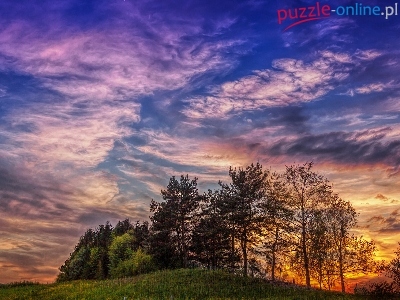 Puzzle Chmury, Wzgórze, Drzewa, Zachód słońca