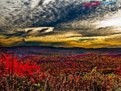 Puzzle Łąka, Zachód Słońca, Chmury, Wzgórza