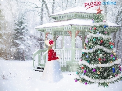 Zima, Choinka, Śnieg, Altana, Boże Narodzenie, Dziewczynka, Drzewa