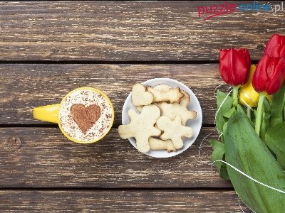 Tulipany, Ciasteczka, Kawa, Kompozycja, Deski
