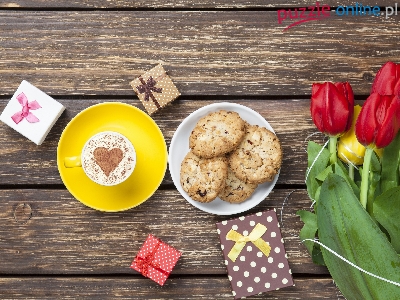 Tulipany, Ciastka, Kawa, Kompozycja, Prezenty