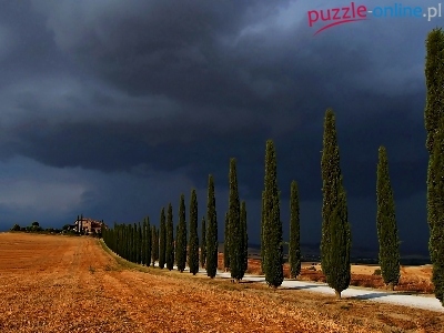 Ciemne, Droga, Dom, Pola, Cyprysy, Chmury