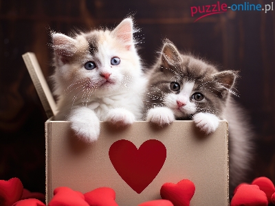 Dwa, Pudełko, Kotki, Ciemne tło, Serduszka