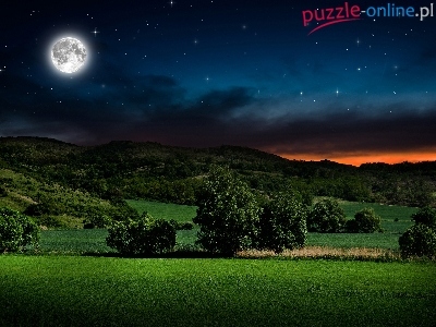 Wzgórza, Ciemne, Księżyc, Drzewa, Zielone, Łąka, Niebo