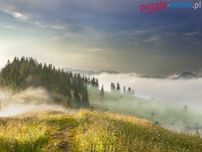Poranek, Ścieżka, Drzewa, Ukraina, Góry Karpaty, Mgła