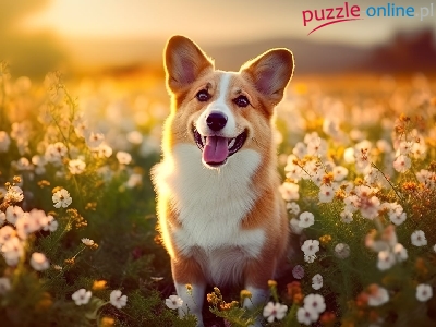 Pies, Spojrzenie, Welsh corgi pembroke, Łąka, Kwiaty