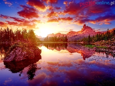 Cortina d’Ampezzo, Drzewa, Wschód słońca, Jezioro Federa, Skały, Włochy, Góry, Chmury