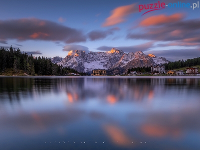 Cortina dAmpezzo, Włochy, Domy, Dolomity, Jezioro, Drzewa, Góry, Misurina Lake