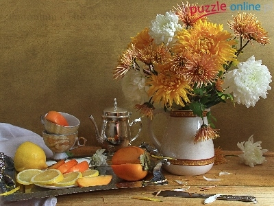 Puzzle Cytryny, Kwiaty, Wazon, Taca