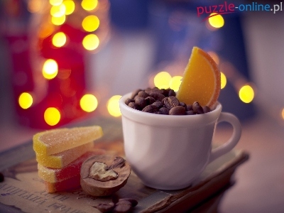 Ziarna, Cytryny, Blask, Plastry, Filiżanka, Kawa, Orzech
