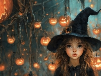 Halloween, Czapka, Dziewczynka, AI, Dynie