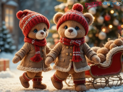 Sanki, Misie, Dwa, Czapki, Choinka, Kożuszki