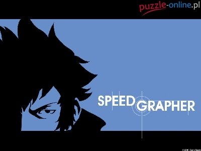 Puzzle czarna postac, Speed Grapher, niebieskie tło