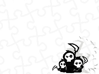 Pan Śmierć, Kosa Ognisty, Potwór Owady, Kobieta, Pęknięcia Morze, Maszty, Żaglowiec, Wzburzone, Drzewa Gargulec, Krzyż Twarz, Kobieta, Folia Cień, Szyba Duch, Jeździec Usta, Kobieta, Twarz, Krew Piekielne, Stwory Zombi Małe, Trzy, Kostuchy Krew, Kobieta, Znak Posąg, Kobieta, Ciernie