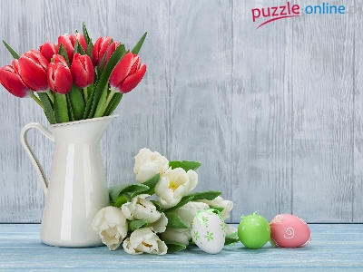 Czerwone, Dwa, Kwiaty, Bukiety, Białe, Pisanki, Deski, Tulipany, Dzbanek