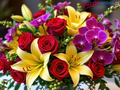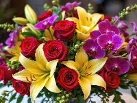 Storczyki, Bukiet, Fioletowe, Żółte, Lilie, Róże, Kwiaty, Czerwone