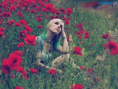 Czerwone, Blondynka, Trawa, Zamyślona, Kobieta, Maki