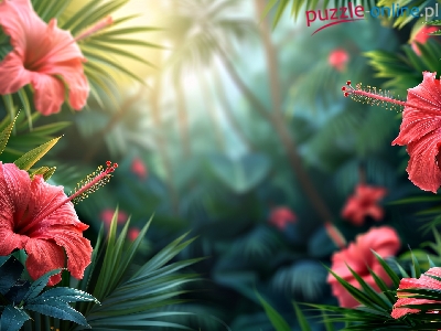 Hibiskus, Czerwone, Kwiaty, Grafika, Liście