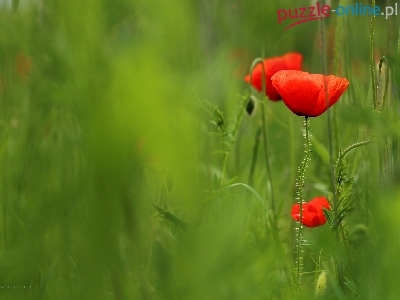 Puzzle Czerwone, Maki, Trawa, Kwiaty