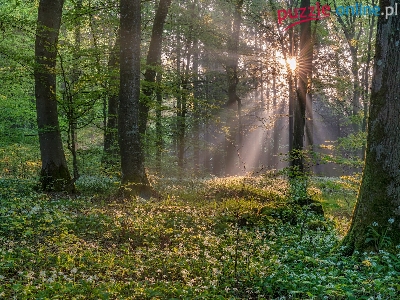 Las, Poranek, Drzewa, Czosnek niedźwiedzi, Promienie słońca