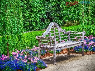 Dallas, Stan Teksas, Park, Ławka, HDR, Dallas Arboretum and Botanical Garden, Stany Zjednoczone, Ogród Botaniczny w Dallas, Kwiaty