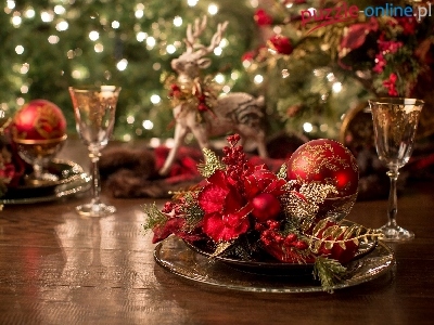 Boże Narodzenie, Stołu, Kieliszki, Stroik, Talerzyki, Kompozycja, Bombki, Dekoracja