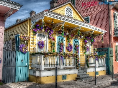 Dekoracje, Nowy Orlean, Żółty, Domek, Świąteczne